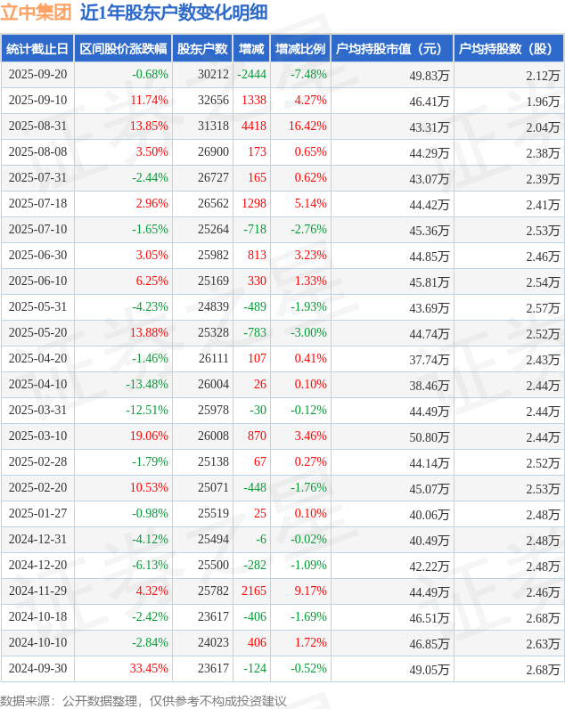 从股价来看,2025年9月10日至2025年9月20日,立中集团区间跌幅为0.68%,在此期间股东户数减少2444.0户,减幅为7.48%。