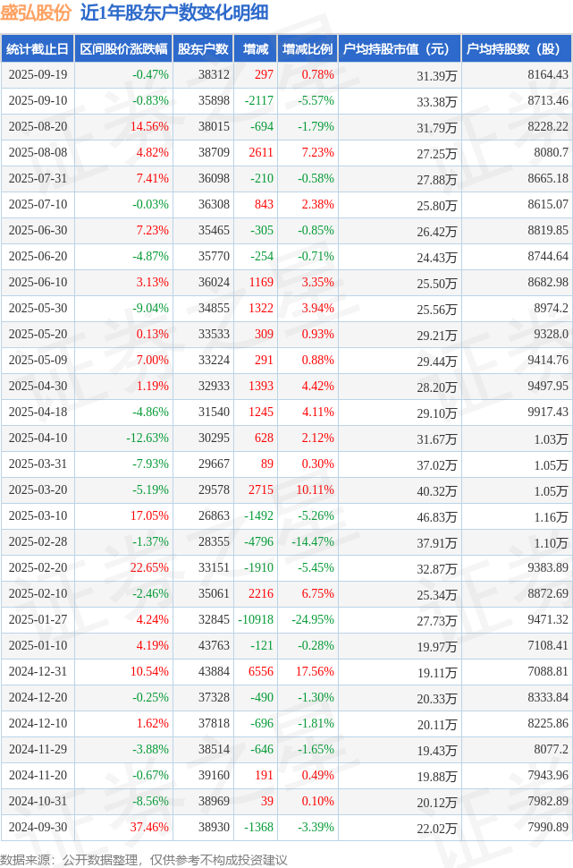 从股价来看,2025年8月20日至2025年9月19日,盛弘股份区间跌幅为0.47%,在此期间股东户数增加297.0户,增幅为0.78%。