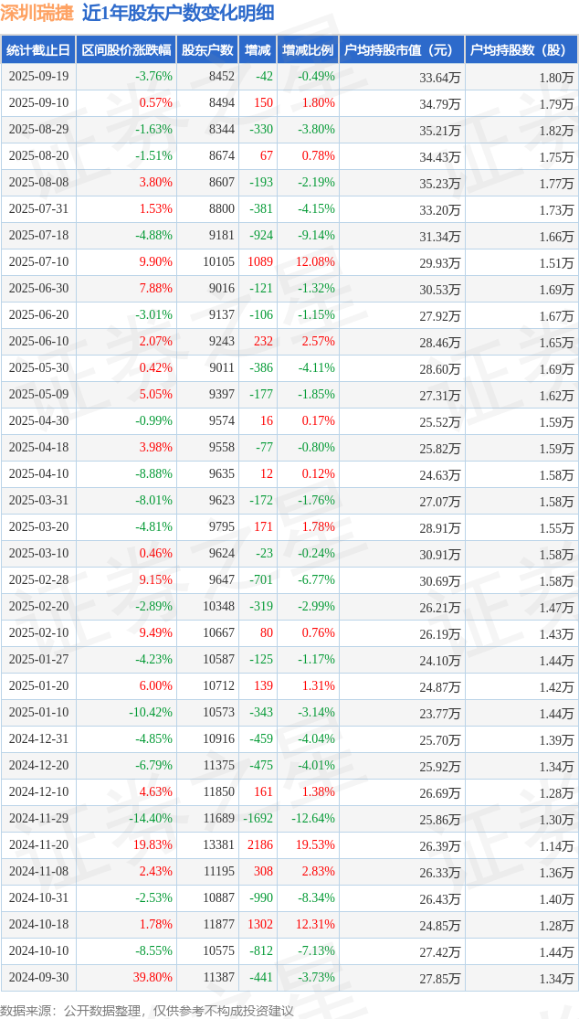 从股价来看,2025年9月10日至2025年9月19日,深圳瑞捷区间跌幅为3.76%,在此期间股东户数减少42.0户,减幅为0.49%。