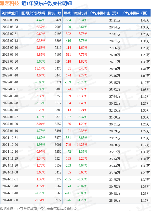 从股价来看,2025年8月8日至2025年9月19日,雅艺科技区间跌幅为4.47%,在此期间股东户数减少584.0户,减幅为8.34%。