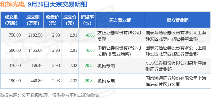证券之星消息,9月26日和辉光电发生大宗交易,交易数据如下: