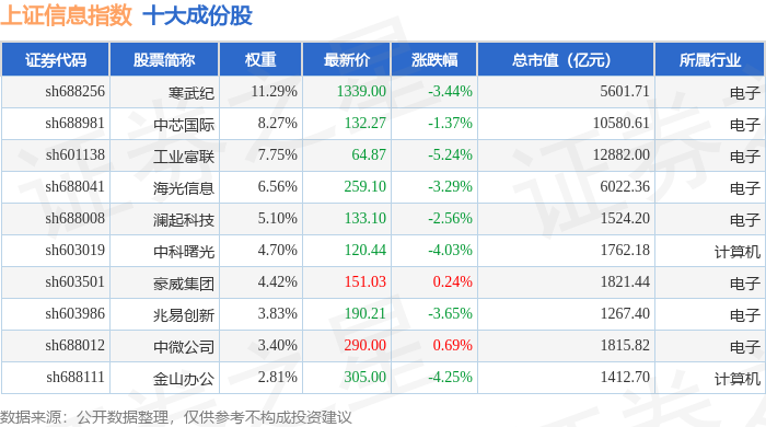 证券之星消息,9月26日,上证信息(000039)指数报收于5854.48点,跌2.61%,成交1550.7亿元,换手率2.94%。当日该指数成份股中,上涨的有13家,晶合集成以16.63%的涨幅领涨,下跌的有37家,瑞芯微以6.75%的跌幅领跌。