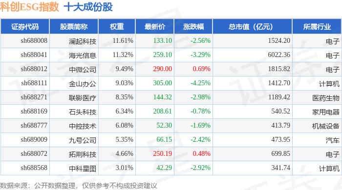 证券之星消息,9月26日,科创ESG(000691)指数报收于1516.17点,跌2.11%,成交547.58亿元,换手率1.51%。当日该指数成份股中,上涨的有16家,华海清科以3.84%的涨幅领涨,下跌的有34家,芯原股份以6.6%的跌幅领跌。
