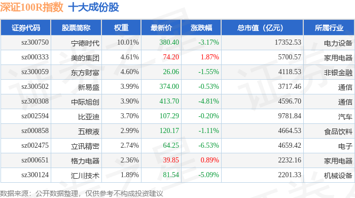 资金流向方面,深证100R(399004)指数成份股当日主力资金净流出合计158.09亿元,游资资金净流入合计50.4亿元,散户资金净流入合计107.7亿元。成份股资金流向详情见下表: