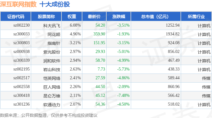 证券之星消息,9月26日,深互联网(399675)指数报收于3663.26点,跌3.59%,成交938.8亿元,换手率4.29%。当日该指数成份股中,上涨的有13家,海联讯以2.17%的涨幅领涨,下跌的有153家,值得买以8.49%的跌幅领跌。