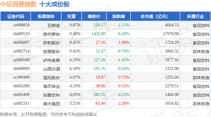 中证消费(399932)指数十大成份股详情如下: