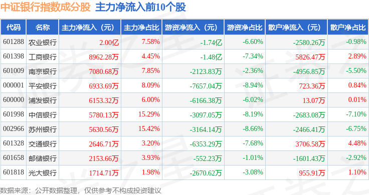 资金流向方面,中证银行(399986)指数成份股当日主力资金净流入合计2.8亿元,游资资金净流出合计5.85亿元,散户资金净流入合计3.04亿元。成份股资金流向详情见下表: