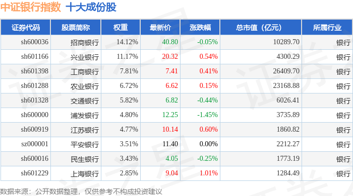 证券之星消息,9月26日,中证银行(399986)指数报收于7311.63点,涨0.11%,成交261.7亿元,换手率0.25%。当日该指数成份股中,上涨的有25家,渝农商行以2.38%的涨幅领涨,下跌的有11家,浦发银行以1.45%的跌幅领跌。