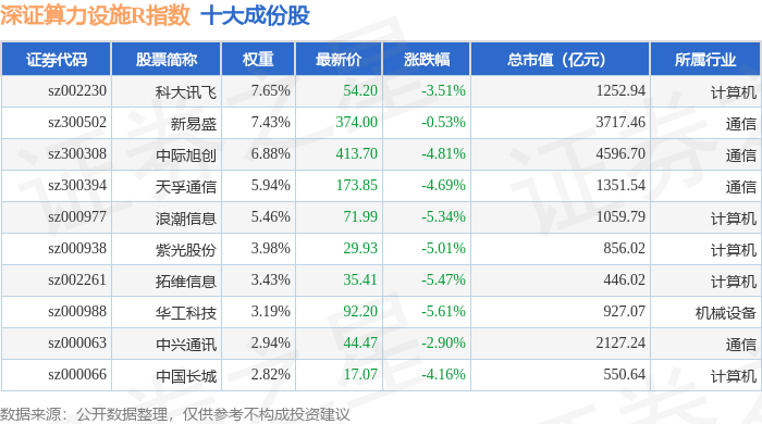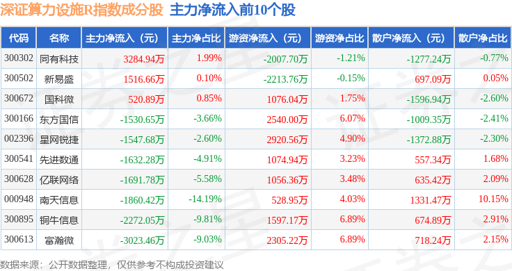 资金流向方面,深证算力设施R(470051)指数成份股当日主力资金净流出合计123.92亿元,游资资金净流入合计39.23亿元,散户资金净流入合计84.69亿元。成份股资金流向详情见下表: