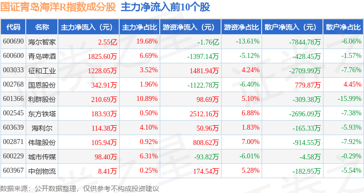 资金流向方面,国证青岛海洋R(480532)指数成份股当日主力资金净流入合计8370.56万元,游资资金净流出合计1.09亿元,散户资金净流入合计2517.54万元。成份股资金流向详情见下表: