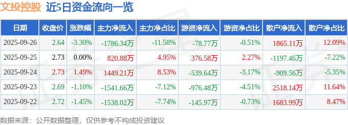 证券之星消息,截至2025年9月26日收盘,文投控股(600715)报收于2.64元,下跌3.3%,换手率2.17%,成交量57.69万手,成交额1.54亿元。