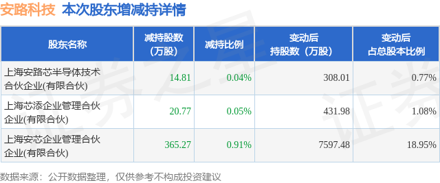 证券之星消息,9月26日安路科技发布公告《安路科技:安路科技关于5%以上股东权益变动触及1%暨减持股份结果公告》,其股东上海安路芯半导体技术合伙企业(有限合伙)、上海芯添企业管理合伙企业(有限合伙)、上海安芯企业管理合伙企业(有限合伙)于2025年9月8日至2025年9月25日间合计减持400.85万股,占公司目前总股本的0.9999%,变动期间该股股价上涨6.09%,截止9月25日收盘报31.51元。