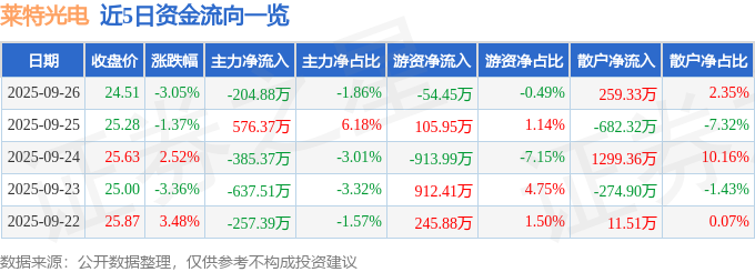 证券之星消息,截至2025年9月26日收盘,莱特光电(688150)报收于24.51元,下跌3.05%,换手率1.1%,成交量4.44万手,成交额1.1亿元。