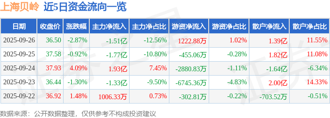 证券之星消息,截至2025年9月26日收盘,上海贝岭(600171)报收于36.5元,下跌2.87%,换手率4.57%,成交量32.43万手,成交额12.03亿元。