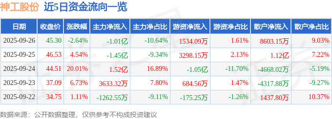 证券之星消息,截至2025年9月26日收盘,神工股份(688233)报收于45.3元,下跌2.64%,换手率12.1%,成交量20.6万手,成交额9.53亿元。