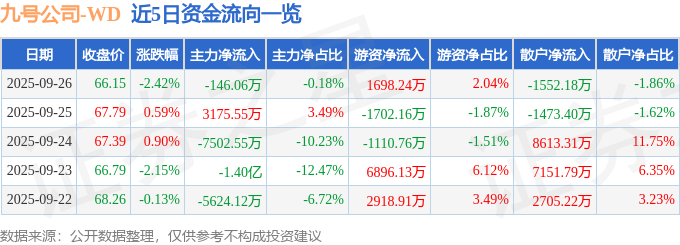 证券之星消息,截至2025年9月26日收盘,九号公司(689009)报收于66.15元,下跌2.42%,换手率2.27%,成交量12.48万手,成交额8.33亿元。