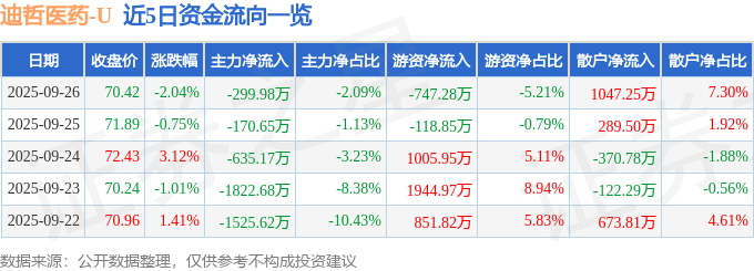 证券之星消息,截至2025年9月26日收盘,迪哲医药(688192)报收于70.42元,下跌2.04%,换手率0.49%,成交量2.03万手,成交额1.44亿元。