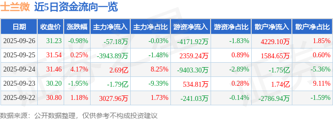 9月26日的资金流向数据方面,主力资金净流出57.18万元,占总成交额0.03%,游资资金净流出4171.92万元,占总成交额1.83%,散户资金净流入4229.1万元,占总成交额1.85%。
