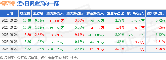 证券之星消息,截至2025年9月26日收盘,福斯特(603806)报收于15.48元,下跌0.51%,换手率0.81%,成交量21.1万手,成交额3.29亿元。