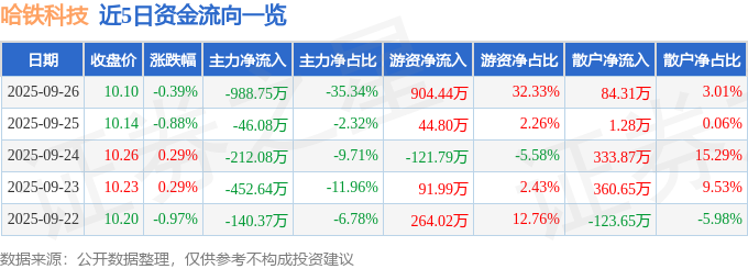 9月26日的资金流向数据方面,主力资金净流出988.75万元,占总成交额35.34%,游资资金净流入904.44万元,占总成交额32.33%,散户资金净流入84.31万元,占总成交额3.01%。
