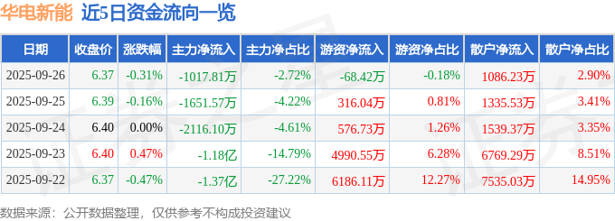 证券之星消息,截至2025年9月26日收盘,华电新能(600930)报收于6.37元,下跌0.31%,换手率2.34%,成交量58.61万手,成交额3.74亿元。
