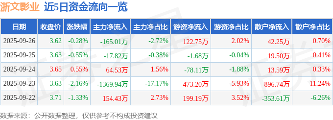 证券之星消息,截至2025年9月26日收盘,浙文影业(601599)报收于3.62元,下跌0.28%,换手率1.44%,成交量16.75万手,成交额6062.75万元。
