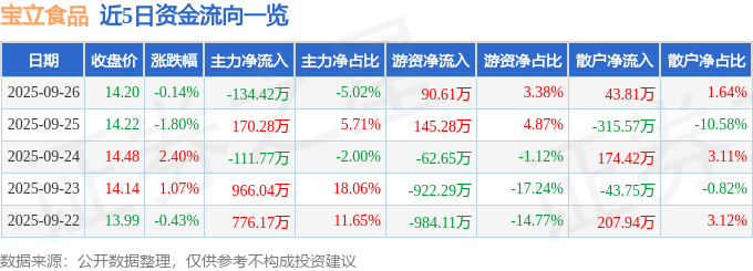 证券之星消息,截至2025年9月26日收盘,宝立食品(603170)报收于14.2元,下跌0.14%,换手率0.47%,成交量1.88万手,成交额2677.82万元。