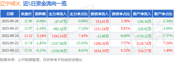 证券之星消息,截至2025年9月26日收盘,辽宁成大(600739)报收于11.96元,下跌0.08%,换手率0.55%,成交量8.43万手,成交额1.01亿元。
