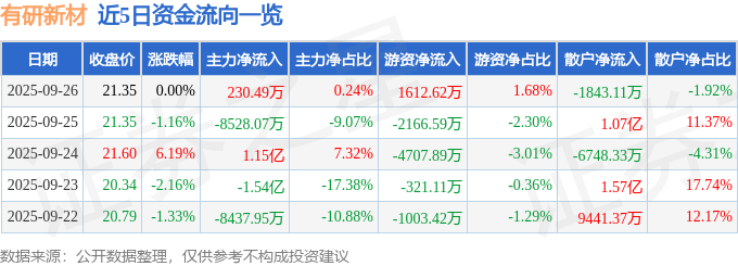9月26日的资金流向数据方面,主力资金净流入230.49万元,占总成交额0.24%,游资资金净流入1612.62万元,占总成交额1.68%,散户资金净流出1843.11万元,占总成交额1.92%。