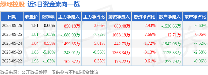 证券之星消息,截至2025年9月26日收盘,绿地控股(600606)报收于1.81元,上涨0.0%,换手率0.91%,成交量127.74万手,成交额2.32亿元。