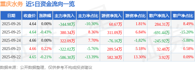 证券之星消息,截至2025年9月26日收盘,重庆水务(601158)报收于4.64元,上涨0.0%,换手率0.15%,成交量7.22万手,成交额3348.02万元。