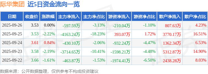证券之星消息,截至2025年9月26日收盘,际华集团(601718)报收于3.53元,上涨0.0%,换手率1.23%,成交量53.85万手,成交额1.91亿元。