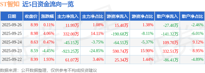 证券之星消息,截至2025年9月26日收盘,ST智知(603869)报收于8.99元,上涨0.11%,换手率0.25%,成交量1.24万手,成交额1114.07万元。