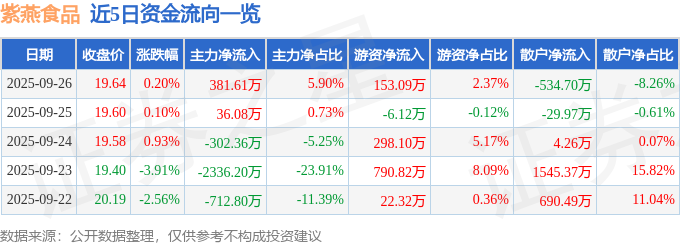 证券之星消息,截至2025年9月26日收盘,紫燕食品(603057)报收于19.64元,上涨0.2%,换手率0.79%,成交量3.26万手,成交额6470.24万元。