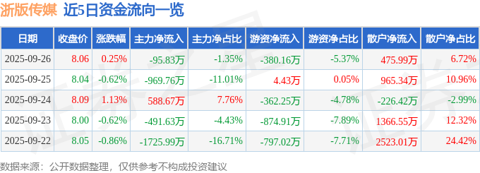 证券之星消息,截至2025年9月26日收盘,浙版传媒(601921)报收于8.06元,上涨0.25%,换手率0.4%,成交量8.8万手,成交额7080.82万元。