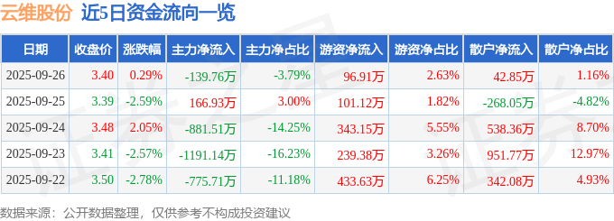 9月26日的资金流向数据方面,主力资金净流出139.76万元,占总成交额3.79%,游资资金净流入96.91万元,占总成交额2.63%,散户资金净流入42.85万元,占总成交额1.16%。