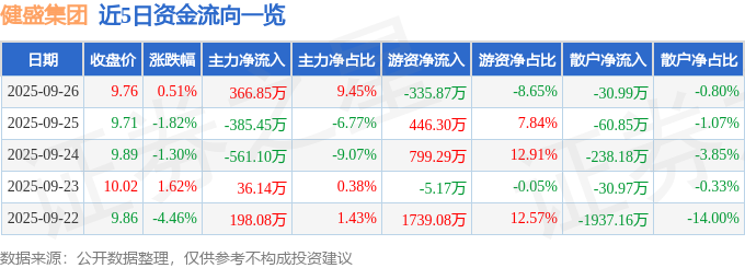 证券之星消息,截至2025年9月26日收盘,健盛集团(603558)报收于9.76元,上涨0.51%,换手率1.16%,成交量3.99万手,成交额3882.32万元。