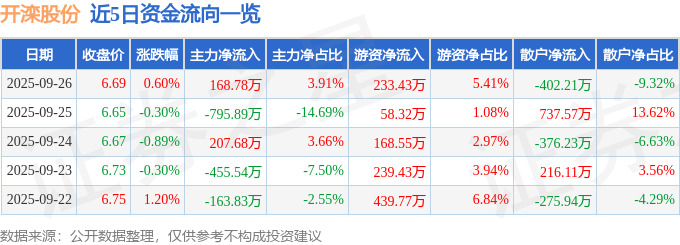 证券之星消息,截至2025年9月26日收盘,开滦股份(600997)报收于6.69元,上涨0.6%,换手率0.41%,成交量6.46万手,成交额4314.18万元。