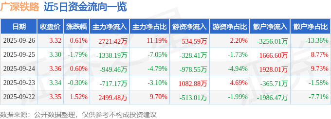 证券之星消息,截至2025年9月26日收盘,广深铁路(601333)报收于3.32元,上涨0.61%,换手率1.31%,成交量73.77万手,成交额2.43亿元。