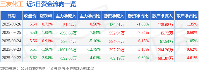 证券之星消息,截至2025年9月26日收盘,三友化工(600409)报收于5.54元,上涨0.73%,换手率0.89%,成交量18.45万手,成交额1.02亿元。