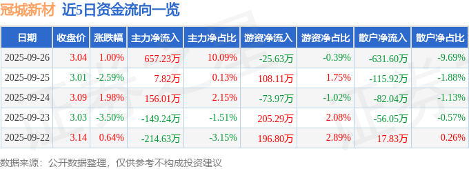 证券之星消息,截至2025年9月26日收盘,冠城新材(600067)报收于3.04元,上涨1.0%,换手率1.54%,成交量21.48万手,成交额6516.61万元。