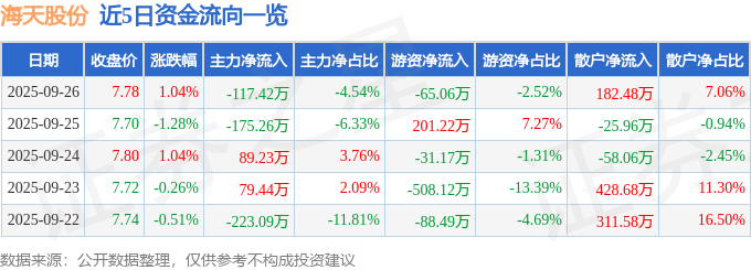 证券之星消息,截至2025年9月26日收盘,海天股份(603759)报收于7.78元,上涨1.04%,换手率0.72%,成交量3.33万手,成交额2584.02万元。