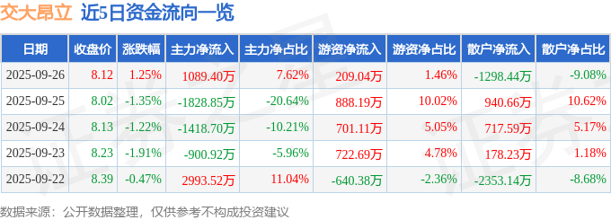 证券之星消息,截至2025年9月26日收盘,交大昂立(600530)报收于8.12元,上涨1.25%,换手率2.27%,成交量17.6万手,成交额1.43亿元。