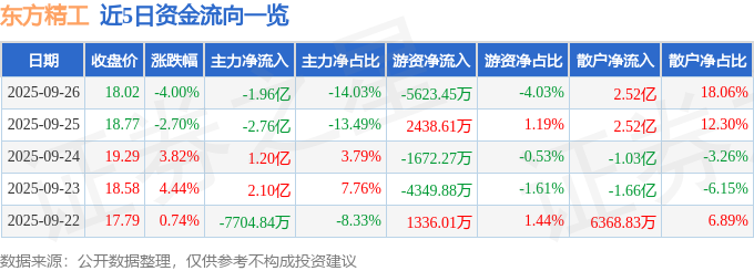 证券之星消息,截至2025年9月26日收盘,东方精工(002611)报收于18.02元,下跌4.0%,换手率7.58%,成交量75.98万手,成交额13.95亿元。
