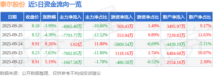 证券之星消息,截至2025年9月26日收盘,泰尔股份(002347)报收于8.18元,下跌3.99%,换手率9.26%,成交量45.71万手,成交额3.81亿元。