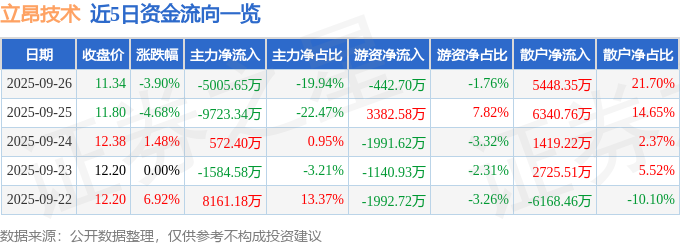 证券之星消息,截至2025年9月26日收盘,立昂技术(300603)报收于11.34元,下跌3.9%,换手率5.89%,成交量21.79万手,成交额2.51亿元。
