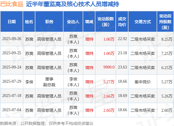 证券之星消息,根据9月26日市场公开信息、上市公司公告及交易所披露数据整理,巴比食品(605338)最新董监高及相关人员股份变动情况:2025年9月25日至2025年9月26日公司高级管理人员苏爽共增持公司股份2.0万股,占公司总股本为0.0084%。变动期间公司股价下跌3.1%,9月26日当日收盘报22.84元。