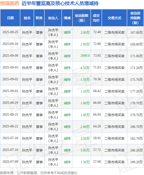 证券之星消息,根据9月26日市场公开信息、上市公司公告及交易所披露数据整理,恒瑞医药(600276)最新董监高及相关人员股份变动情况:2025年9月25日公司董事孙杰平共减持公司股份2.0万股,占公司总股本为0.0003%。变动期间公司股价上涨3.08%,9月25日当日收盘报72.27元。