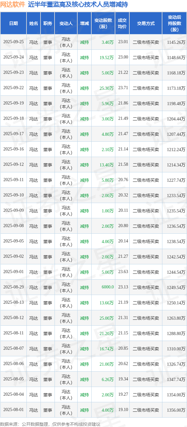 网达软件近半年内的董监高及核心技术人员增减持详情如下: