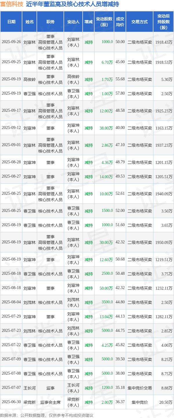 富信科技近半年内的董监高及核心技术人员增减持详情如下: